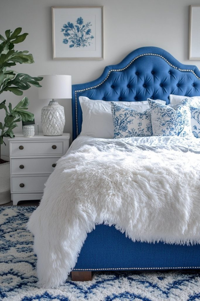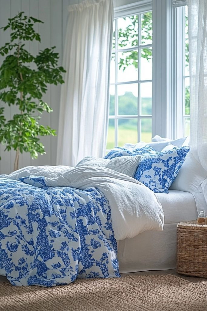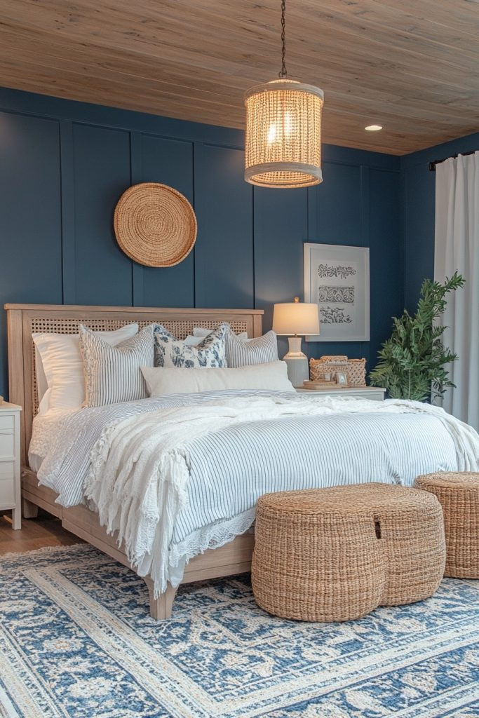 Coastal Cool combines crisp navy blue and soft white to evoke the clean, refreshing feel of a coastal boho bedroom. This palette is perfect for creating a serene, nautical-inspired space that feels both wonderfully fresh and deeply tranquil. Classic striped patterns and natural fibers like soft cotton or sturdy jute can add a perfect maritime touch without resorting to any clichéd decor. Pale wood and elegant glass accents can keep the space light and beautifully airy.