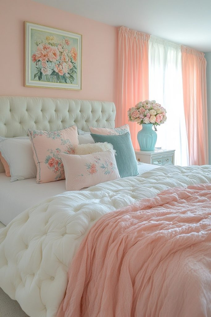 Pastel Paradise thoughtfully combines soft pinks and light blues to create a dreamy and whimsically inviting boho bedroom. This palette is absolutely perfect for those who desire a gentle, uplifting space. To enhance the dreamlike quality, add fluffy textiles and subtle, delicate floral patterns. Light woods and creamy whites can serve as a soft, comforting backdrop that truly allows the beautiful pastel colors to shine.