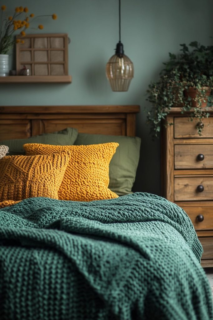 Autumn Whisper gently brings together muted olive greens and warm mustards, evoking the soft, comforting tones of autumn in a boho bedroom. This inherently warm, earthy palette is perfect for creating a cozy, inviting space that feels truly grounded and deeply serene. Textures like chunky knits and soft felt can add immense comfort and warmth, beautifully enhancing the autumnal vibe. Subdued lighting can thoughtfully highlight the richness of the colors, making the space feel more intimate.