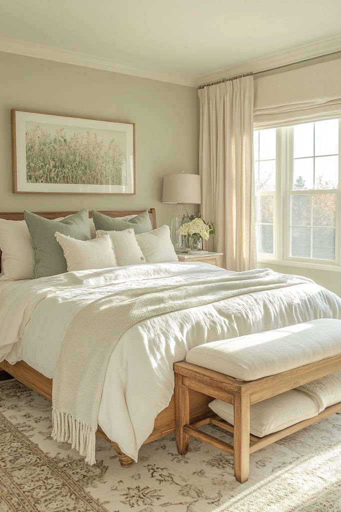 Tranquil Retreat uses soothing sage green and calming dove gray to create a balanced and peaceful boho bedroom. This palette is perfect for those seeking a space that feels grounded and profoundly soothing. Natural materials like cool stone or unfinished wood can beautifully complement the earthy tones, enhancing the overall tranquil vibe. Soft, plush textiles in coordinating colors can add immense comfort and warmth, making the bedroom a true, restorative retreat.