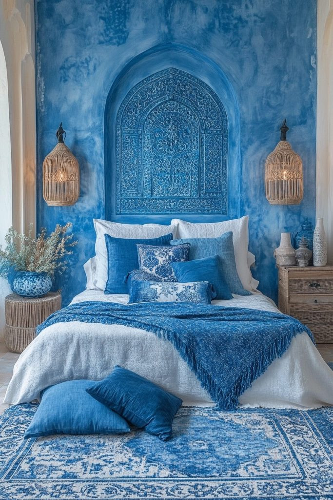 Bohemian Blues combines striking cobalt and serene cerulean to create a cool, calming boho bedroom. This palette is perfect for crafting a space that feels both serene and deeply reflective. Lighter shades of blue can be thoughtfully used in textiles and wall colors to maintain a light, airy feel, while darker blues add profound depth and focus. Natural materials like bleached wood or woven baskets can beautifully complement the blues, enhancing the authentic bohemian feel.