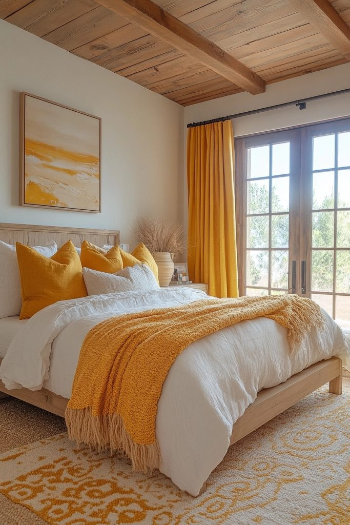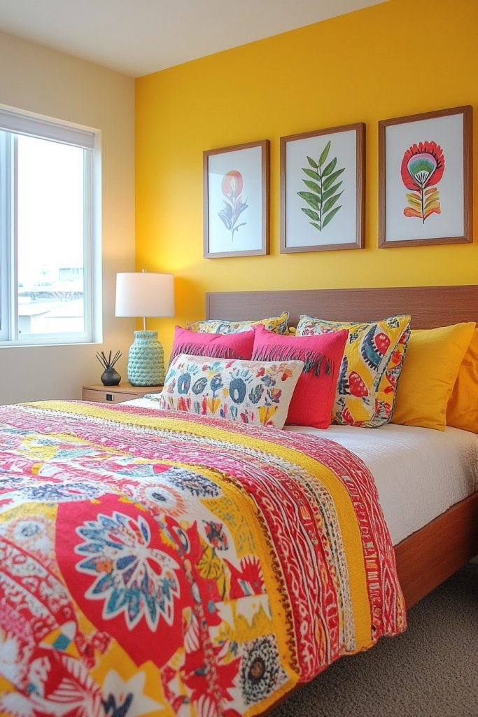 Carnival Brights features fiery reds and sunny yellows to create a lively and wonderfully energetic boho bedroom. This palette is perfect for those who love a bold, festive atmosphere that’s bursting with life and vibrant color. Bright, exuberantly patterned textiles and dynamic wall art can significantly enhance the carnival vibe, while simple furniture in neutral tones keeps the room from feeling too overwhelming. Incorporating elements like colorful glass or shiny metal can add a playful, whimsical touch.