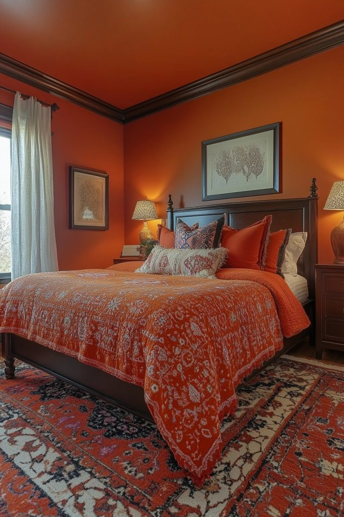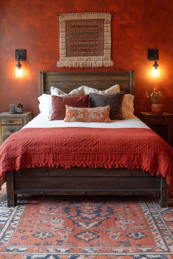 Moroccan Spice brings bold oranges and fiery reds to the boho bedroom, powerfully evoking the vibrant energy of a bustling Moroccan bazaar. This palette is perfect for creating a warm, incredibly inviting space that genuinely stimulates the senses. Rich, intricately patterned textiles and ornate lanterns can significantly enhance the Moroccan feel, while dark wood furniture provides a strong grounding element. Vibrant wall art or colorful tiles can add an authentic Moroccan flair.