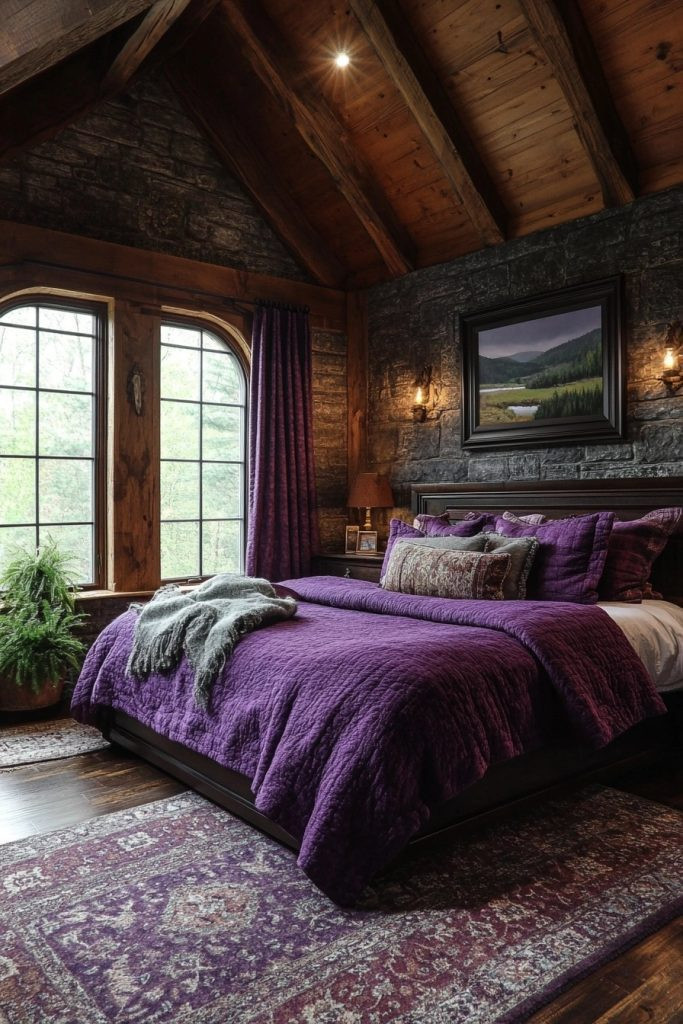Highland Hues combines beautiful heather purples and mossy greens to evoke the rugged, wild beauty of the Scottish highlands in a boho bedroom. This palette is perfect for creating a space that feels both untamed and wonderfully cozy. Tweed or woolen textiles can add a genuine rustic touch, while soft, ambient lighting highlights the rich depth of the earthy colors. Incorporating natural elements like rough-hewn wood or raw stone can further enhance the deep connection to the highland landscape.