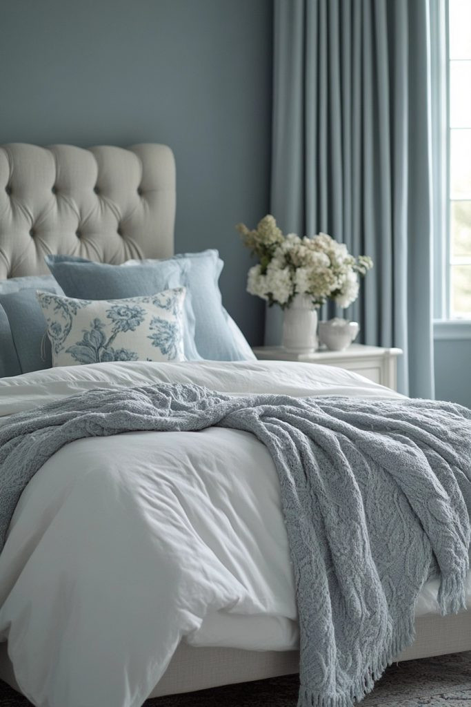 Ethereal Elegance uses soft gray and tranquil blue to craft a light, incredibly ethereal boho bedroom that feels like a peaceful sanctuary. This palette is perfect for creating a space that gently invites relaxation and quiet contemplation. Light, flowing fabrics and delicate textures significantly enhance the airy feel, while minimalist decor keeps the focus squarely on the soothing colors. Subtle metallics or elegant glass accents can add a touch of refined elegance without ever overpowering the serene vibe.