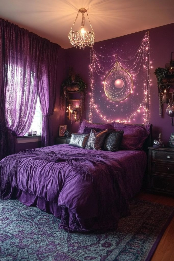 Celestial Shades uses deep purples and shimmering starry silvers to create a mystical and serene ambiance in a boho bedroom. This palette is perfect for those who are drawn to the magic of the night sky and its quiet mystery. To accentuate the celestial theme, use reflective metals and delicate shimmering fabrics that beautifully catch the light like distant stars. Dark walls can serve as a dramatic backdrop for lighter, sparkling accents, enhancing the ethereal feel.