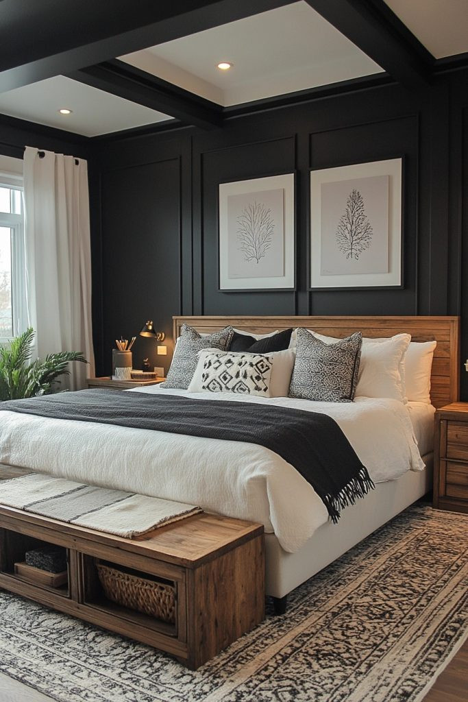 Monochrome Magic creates a bold and visually striking boho bedroom using only classic black and white. This palette is absolutely perfect for those who deeply appreciate the dramatic contrast and powerful visual impact of monochrome. Patterns play a key role in this style, with intricate geometric or tribal prints adding fascinating complexity and interest. Minimalist furniture and decor can effectively keep the space from feeling cluttered, while textured black or white textiles add comforting warmth and subtle depth.