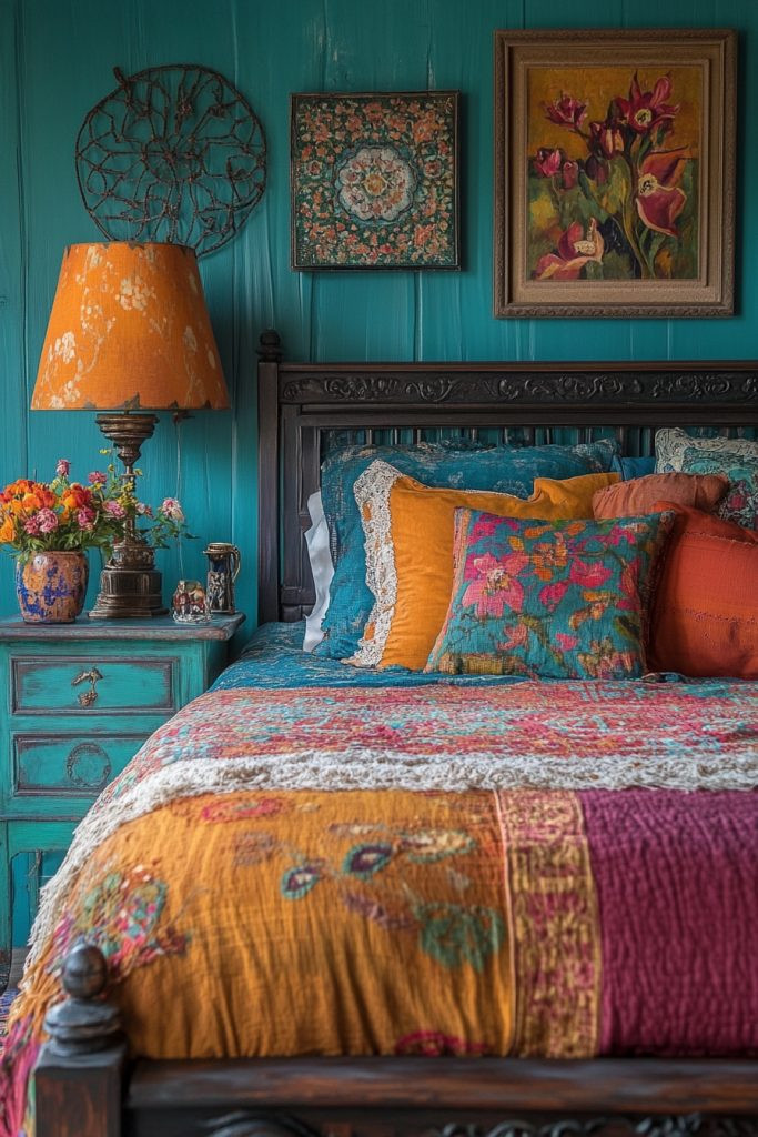 Gypsy Jewel features vibrant turquoise and rich jade to create a dynamic and truly exotic boho bedroom. This palette is absolutely perfect for those who want a bold, spirited space filled with boundless energy. Incorporating metallic gold or shimmering brass accents can significantly enhance the richness of the colors, adding a touch of opulent luxury. Rich textures like plush velvet or smooth silk can add wonderful depth and high-end feel to the vibrant hues.