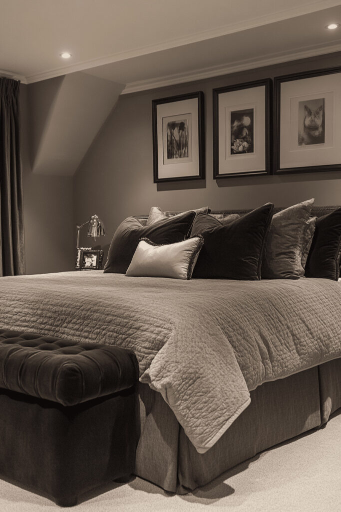 Opt for an elegant monochrome bedroom by using various shades of a single color, creating a sophisticated and unified look. This style is timeless and can make your basement feel larger and more refined. Incorporate textures like plush carpets and satin drapes to add depth to the monochrome palette. This basement bedroom idea is ideal for those who appreciate subtle elegance.