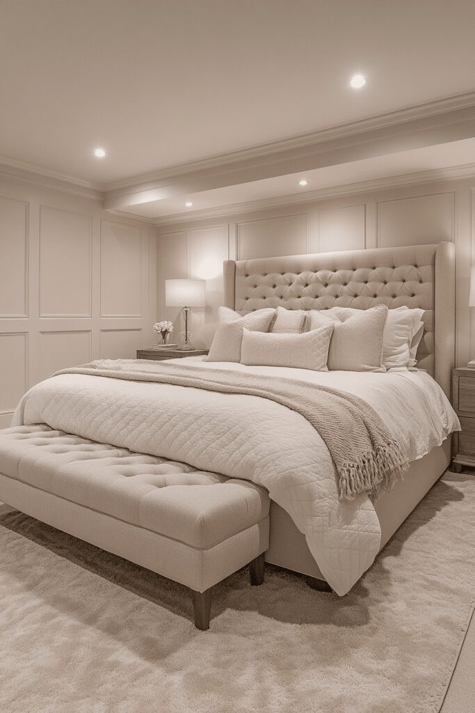 Create an understated luxury bedroom with subtle elegance, high-quality materials, and a focus on pure comfort. Use a soft, neutral color palette and sumptuous bedding to make the space inviting and relaxing. Include refined art and decor that speaks of sophisticated taste without being overly bold. This basement bedroom idea is perfect for those who love luxury without ostentation.