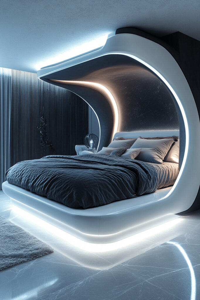 Set up a futuristic fantasy bedroom with modern, abstract furniture and advanced technological features. This theme can include elements like virtual reality stations or automated systems that make the room feel like it’s from another time. Use metallic and glossy finishes to enhance the futuristic vibe. This basement bedroom idea is perfect for those who love science fiction and dreaming about the future.