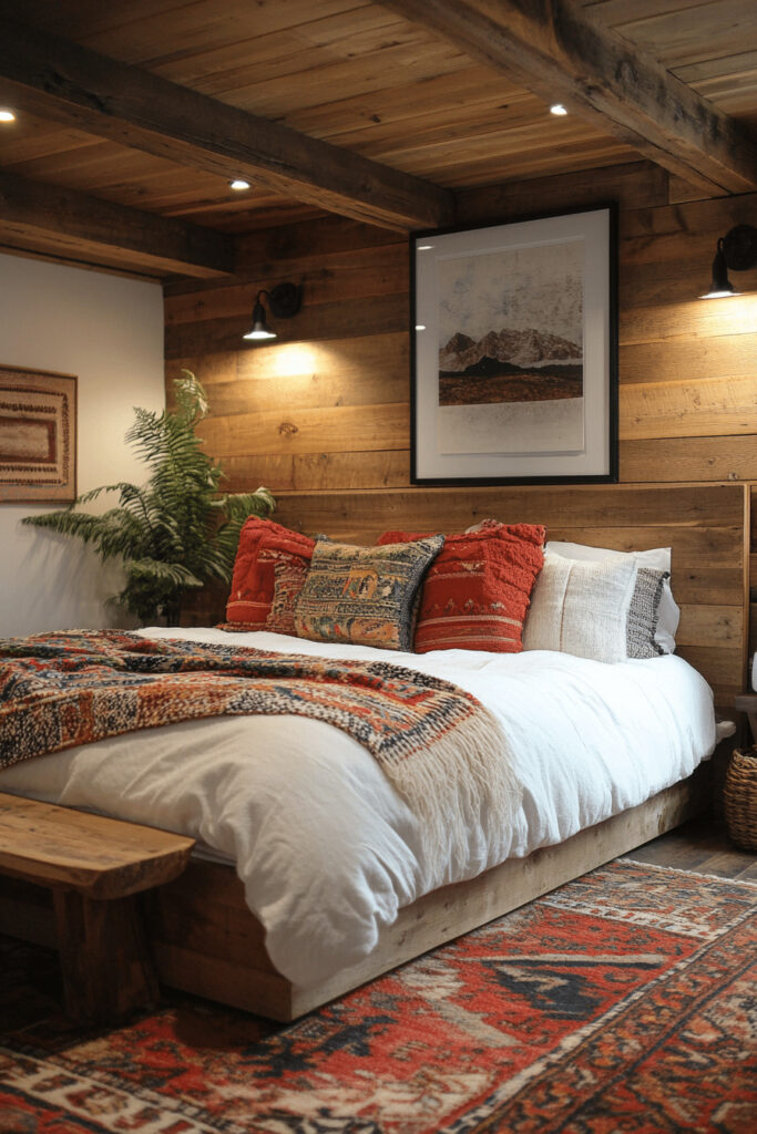 Create a relaxed and artistic boho chic hideaway with bright colors, unique patterns, and a variety of textures. Incorporate hanging textiles, colorful rugs, and special artifacts to achieve a truly personal look. This basement bedroom concept is ideal for those who love creative and free-spirited environments. Adding plants can also bring life and freshness into the space, making it feel vibrant and inviting.