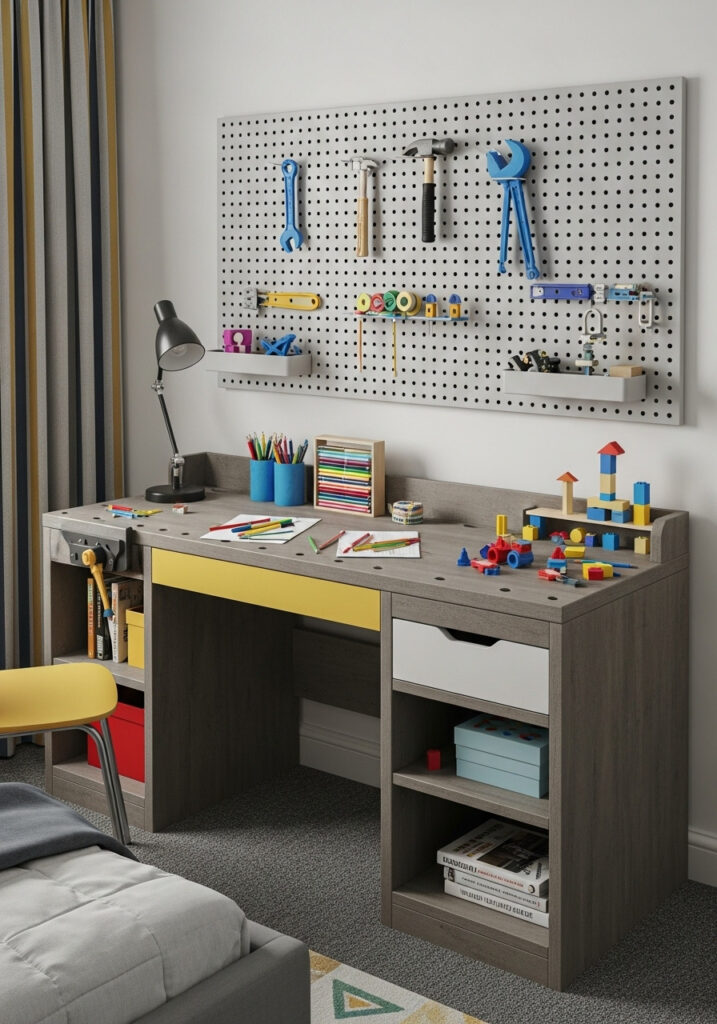 Imagine a contemporary kids’ bedroom designed specifically for young innovators and crafters. This concept transforms the room into a personal workshop where creativity takes center stage. Think about including a sturdy, adjustable workbench or desk with integrated storage for tools and materials like LEGOs, art supplies, or building kits. A pegboard wall can offer flexible storage and display for projects. The color scheme should be practical and inspiring, perhaps with durable, easy-to-clean surfaces. This design is perfect for encouraging hands-on learning, problem-solving, and endless imaginative construction.