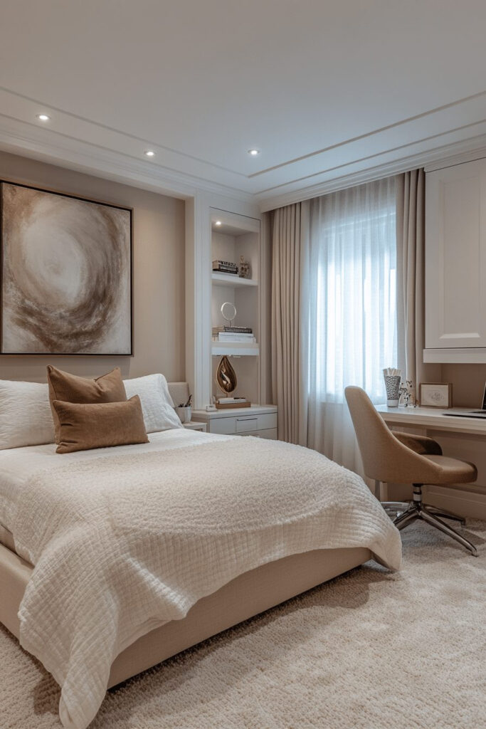 A luxury contemporary kids’ bedroom focuses on high-end finishes, plush furnishings, and designer elements for an opulent feel. From soft velvet pillows and gold-accented furniture to elegant lighting fixtures, this room feels refined and sophisticated. Neutral tones and rich textures create an opulent yet cozy atmosphere. The design is both stylish and highly functional, ensuring both ultimate comfort and a touch of luxury for the child.