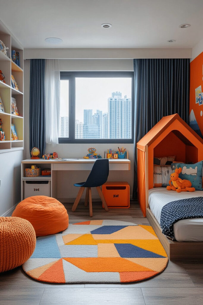 A contemporary kids’ bedroom with a dedicated play zone includes a section specifically for toys, games, and interactive activities. Modern furniture, like multi-functional beds or modular play units, ensures the room is both practical and incredibly fun. Bold colors, soft rugs, and creative storage solutions make the play area vibrant and inviting. This design style thoughtfully emphasizes play while maintaining a tidy, functional space for everything else.