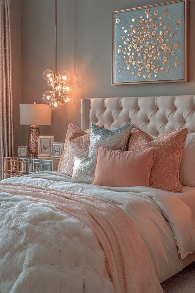 A glamorous contemporary kids’ bedroom incorporates chic accents like mirrored furniture, glittery finishes, and statement lighting to create a dazzling space. Soft fabrics like velvet and satin add sophistication and comfort. The room’s color palette is often neutral, with metallic or jewel-toned highlights to create an upscale look. This design style feels both luxurious and playfully fun, perfect for a child who adores all things glamorous and sparkly.