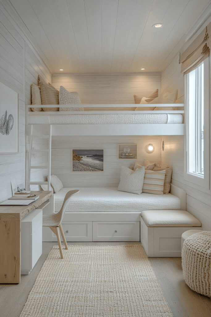 A contemporary kids’ bedroom with a loft bed smartly maximizes space by raising the sleeping area, leaving more room below for play and storage. Loft beds offer a stylish, space-efficient solution while creating an elevated sleeping nook that feels special and private. The rest of the room is open for creative activities or study areas, making it incredibly versatile for growing children. This design is ideal for smaller rooms or for kids who need both a bedroom and a dedicated play area.
