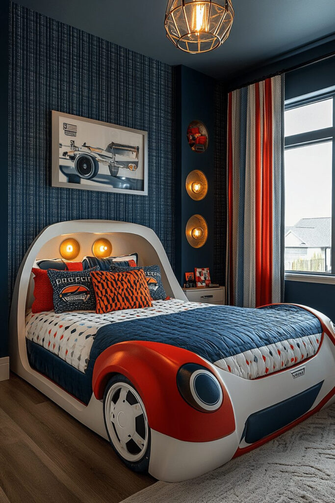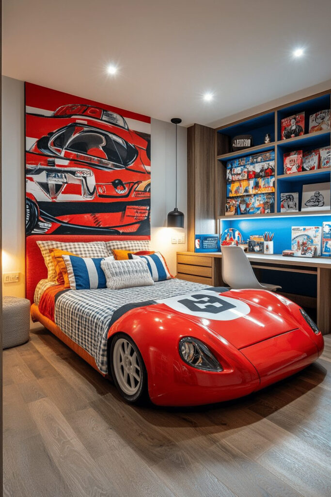 A sports-inspired contemporary kids’ bedroom features furniture, bedding, and decor with an athletic twist, like a bed shaped like a race car or basketball-themed accessories. The room is designed with high-energy colors and patterns that represent various sports, while sleek, modern furniture maintains a stylish and organized look. Storage solutions are functional, keeping equipment and gear tidy. The space is both motivating and exciting, ideal for a young athlete or sports enthusiast.