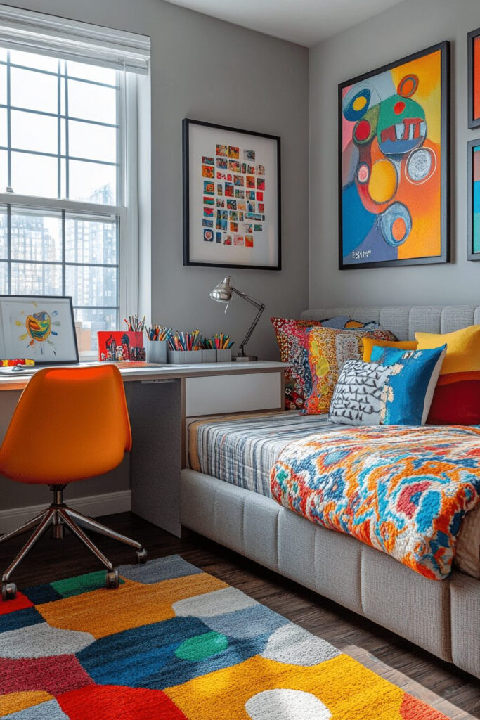 An artistic contemporary kids’ bedroom is perfect for young creatives, thoughtfully incorporating bold colors, unique art pieces, and imaginative design elements. The walls may feature large murals, abstract paintings, or dedicated spaces for the child’s own evolving artwork. Furniture is modern and clean-lined, allowing the vibrant art and decor to truly shine. This style encourages kids to embrace their creativity while providing a fun, inspiring environment.