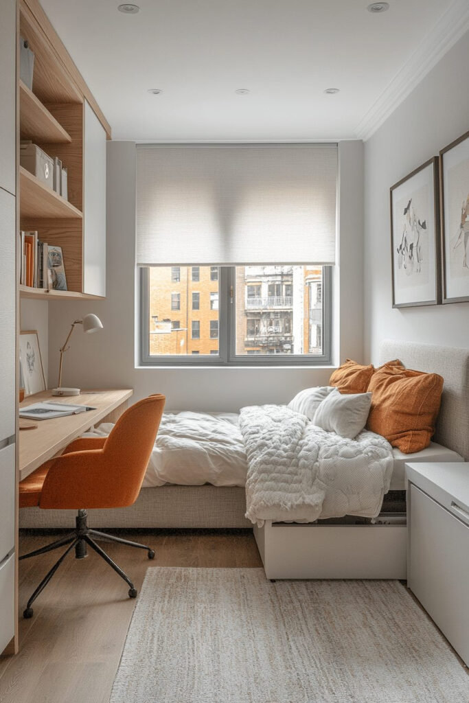 A contemporary kids’ bedroom with built-in storage is meticulously designed to maximize space and minimize clutter. Smartly integrated storage solutions, such as under-bed drawers, wall-mounted shelves, and multifunctional furniture, ensure that toys, clothes, and books all have their designated place. The room feels organized, highly functional, and stylish, with minimal disruption to the overall design. This style is perfect for smaller rooms or for parents who prioritize a tidy environment.