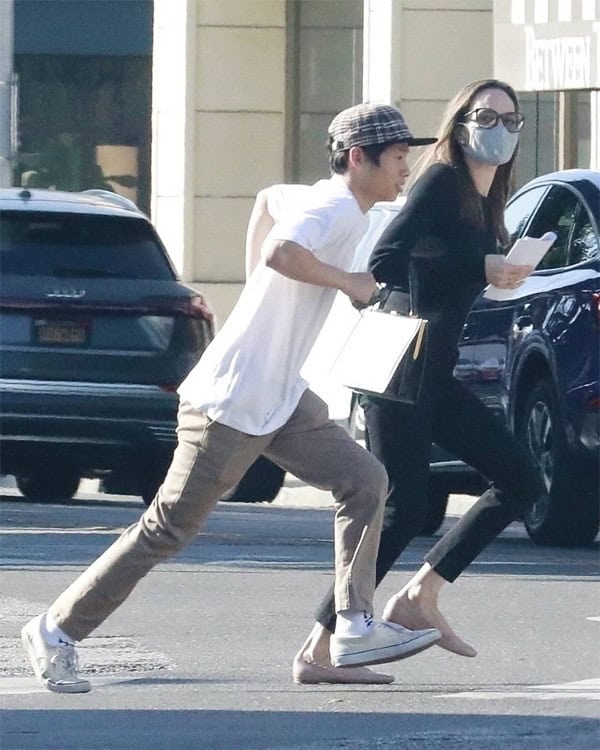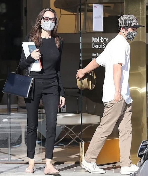 Actress Angelina Jolie was spotted shopping for furniture in Los Angeles with her son Pax Thien. The mother-son duo kept their outfits casual, with Jolie wearing a simple ensemble and a face mask, while Pax Thien opted for a t-shirt and khaki pants.