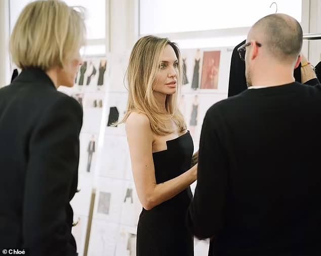 In the images released by the fashion house, Jolie is dressed in an elegant sleeveless black gown, her hair styled straight as she works with the Chloe team on the upcoming range.