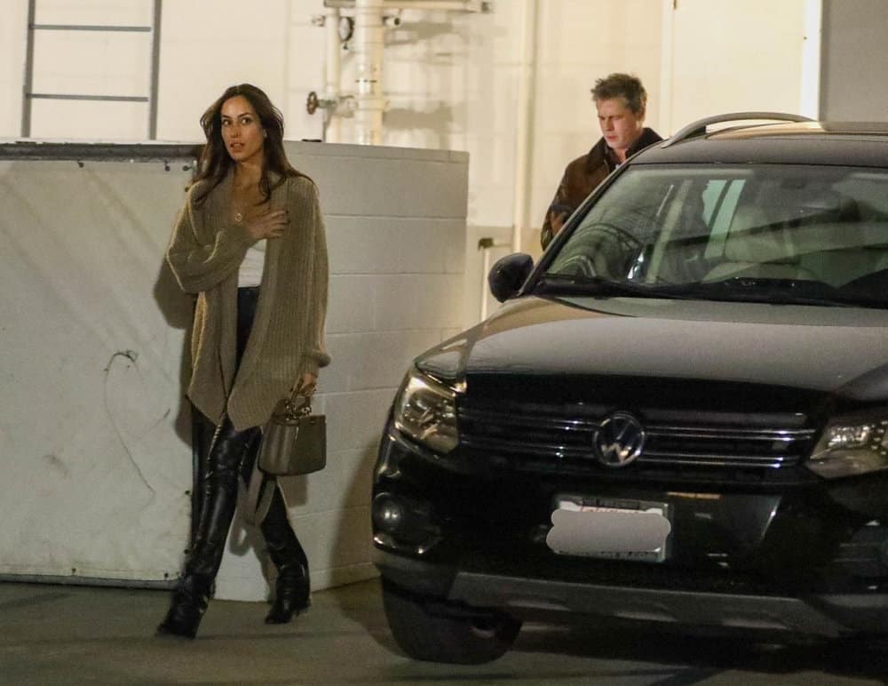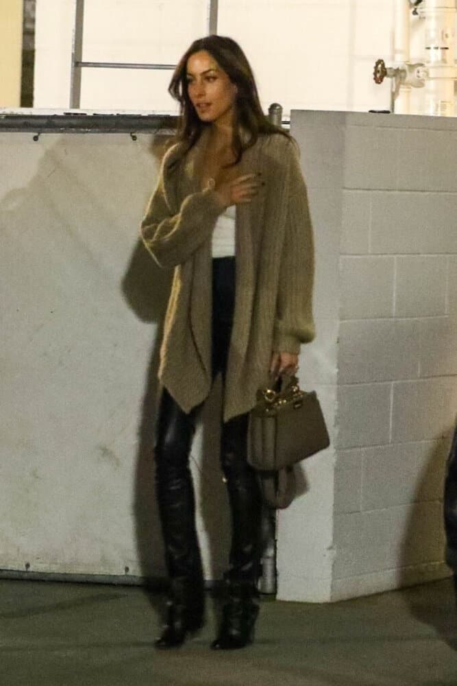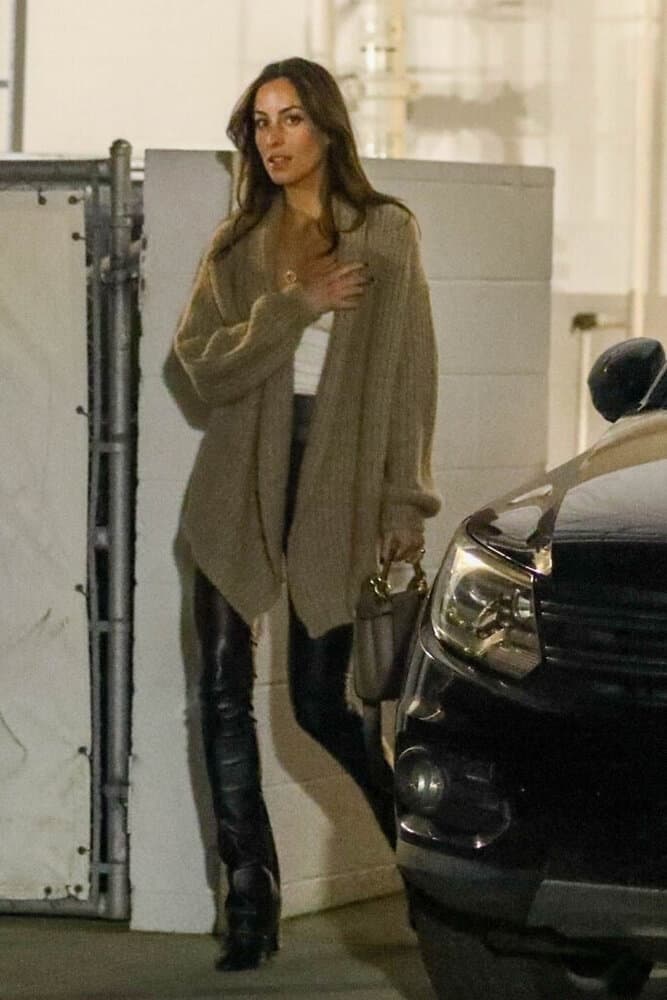 Ines de Ramon, 32, a jewelry designer and ex-wife of “Vampire Diaries” star Paul Wesley, matched Pitt’s chic style with a beige cardigan, high-waisted leather trousers, and a white tank top.