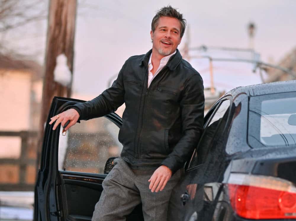 Pitt looked stylish in a brown leather bomber jacket with fur trim, dark wash jeans, and a black polo shirt. He completed his look with dark boots and his signature spiked hair.